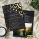 Rich and elegant dark canvas pattern background with festive and fanciful real foil decorative wedding invitations. Decorative swirls with leaves and roses, and beautiful fonts with swirl ligatures. Simple, modern and classic clean wedding invitation, with your custom photo, black and foil swirls and dark grey swirls, wedding details and further information on the back side of the card.