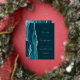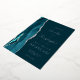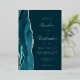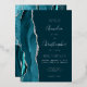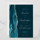 The left-hand edge of this elegant modern wedding invitation features a teal watercolor agate border trimmed with faux silver glitter. The customizable text combines real silver foil handwriting, copperplate and italic fonts on a dark teal blue background. The reverse side features a matching teal and silver agate design.