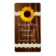 Stylish wedding mini wine / champagne bottle label done in a beautiful dark brown wood look. Graphics of ivory eyelet ribbon with a band of yellow and white gingham stretches across the top and bottom of the label, with a big sunflower bloom, on the top ribbon. Text, in cream, is fully customisable and ready to personalise for your special day. Great for your wedding reception table or gift wines.