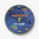 A fun blue and bright yellow, orange and green grunge "Nerf" Wars inspired paper plate design for your child's next battle party!