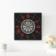 This wall clock displays a small dartboard like design in the centre with style and look plus black, red and green colours with numbers around the outside in this gameroom/cave lover theme inside of red Roman numeral numbers with red & green accents. This clock is made for any wall and printed with a AcryliPrint®HD process measures 10.75" x 10.75" and made from grade-A acrylic. Battery operated uses one AA battery for Indoor use only, not recommended for outdoor use.