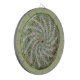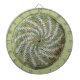 Photo image of a round crocheted pad with variegated greens as a background and white as the spiral arms radiating out from the centre. Edge of board is a medium yellow-green (may be customised).