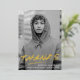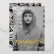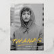 Modern graduation thank you card featuring the graduate's vertical photo with "Thanks" in real gold foil handwritten lettering with a dash below. Personalise the trendy photo graduation thank you card by adding the graduate's name and school name. The gold foil graduation thank you card reverses to display your typed or handwritten message with a background of black and white dashed brushstrokes.