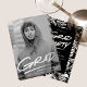 Modern graduation party invitation featuring the graduate's vertical photo with "Grad" in real silver foil handwritten lettering with a dash below. Personalise the trendy photo graduation party invite by adding the graduate's name and school name. The silver foil graduation party invitation reverses to display your party details with a black and white dashed brushstroke background.