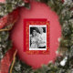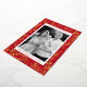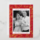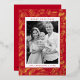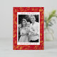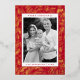 Modern holiday card featuring your photo framed in white with a red and gold foil dashed geometric pattern. Personalise the foil holiday card with your custom greeting, family name, and year in bold red lettering. The unique Christmas card reverses to display your custom message in white lettering with a red background.