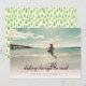 Dashing through the sand Christmas photo cards featuring beach theme with full bleed picture, script overlay and cute christmas tree pattern (back). Easily customize beach holiday cards with your text and favorite images.