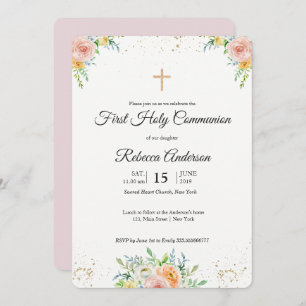 First Holy Communion Pink Dusty Rose Greenery Inv Invitation