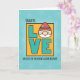 Adorable Birthday card for your Daughter with a clever pun in the outside sentiment. Colourful, illustrated cartoon features a garden gnome with white beard and red hat on orange background, framed in teal with retro daisy pattern. Sure to get a smile from your honey!