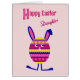 This is a colorful Easter card sure to delight your daughter. The Easter bunny is shaped and decorated like an Easter egg, with colorful stripes, spots and zigzags in shades of pink, yellow and blue, and the background of the card is pale pink. The message inside can be personalized, or you can use the greeting provided "A happy Easter bunny is here to wish a special daughter a very Happy Easter!"