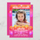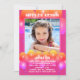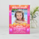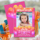 Child's birthday party invitation with pink and orange balloons design. Add a picture of a daughter, or child being celebrated, to the square template. Fun, printed white text is easy to customise for any party plans. "Happy (age) Birthday" at the top, with her name beneath the photo. All party text is added in a paragraph. Orange, pink and lavender balloons decorate the front and back of cards. Choose printed invitations or use the instant download option to share online.