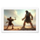 A depiction of a young David with a slingshot confronting the giant Goliath in a desert landscape. The scene conveys an epic and adventurous moment.