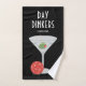 Martini theme pickleball "Day Dinkers" Team Name hand towel for a pickleball team, club, or ladder tournament prize features a black background with a martini glass and pickleball ball accents in a unique and fun retro design with editable name text and background colours.