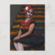 A woman dressed in traditional Dia de los Muertos attire sits on steps adorned with marigold flowers. Her face is painted with intricate sugar skull designs.