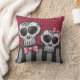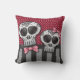 Cute pillow with reversible design. One side boasts beautiful pink and red polka dot pattern background with grey and black pirate stripes, tied together with a sparkly black ribbon and a bride and groom dia de los Muertos sugar skull pair. The back has bold vertical stripe pattern. Full of sparkly fun. Cute. Girly. Versatile.
