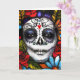 Vibrant floral Day of the Dead image. Rich jewel toned flowers surround a woman's face painted for the Mexican Day of the Dead. Take time to smell the roses, and send a lovely greeting card...