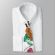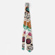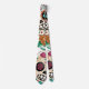 This men's dress tie has a colourful Dia de los Muertos or Day or the Dead theme over a white background. Two large sugar skulls are accented with pink and orange flowers, and floral greenery.