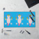 This awesome desk mat features a digital art image of a cute axolotl, a Mexican Salamander, wearing a sombrero and shaking maracas. The axolotl is pale pink with bright pink feathery gills and a bright pink tail. It has huge eyes and a smile on its face. The sombrero is yellow with a green cactus in the middle. The cactus is surrounded by chilies and Mexican sunflowers, also called Tithonia. The Maracas are yellow with red and green flowers and wavy lines on them.