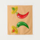 This awesome tapestry features a pair of chilis, a red chilli and a green chilli. They both have black eyes and pink mouths. Each Chilli is wearing a sombrero hat that has a skull of the opposite colour to the chilli on it in celebration of the Mexican Day of the Dead festival, Dia De Los Muertos. The sombrero also contains three flowers with alternating red and green petals representing the flag of Mexico.