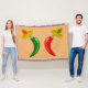 This awesome throw blanket features a pair of chilis, a red chilli and a green chilli. They both have black eyes and pink mouths. Each Chilli is wearing a sombrero hat that has a skull of the opposite colour to the chilli on it in celebration of the Mexican Day of the Dead festival, Dia De Los Muertos. The sombrero also contains three flowers with alternating red and green petals representing the flag of Mexico.