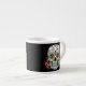 White ceramic espresso cup with an image, on both sides, of a Day of the Dead skull decorated with pink flowers and vines, red roses and a cross with four drops of blood on black. The Day of the Dead, or All Souls' Day, is celebrated on November 2 in various European and Latin American countries. In Mexico the period of All Souls' Day festivities is held for several days, including All Saints' Day on November 1. See matching mug, candy jar, paper plate, square ceramic tile and coasters. See the entire Mexico Mug collection in the HOME section.