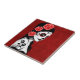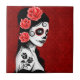 This Day of the Dead inspired design features a beautiful woman with sugar skull patterns on her face. Three roses appear in her jet black hair with two more roses tattooed on her arm. The girl is standing sideways with her head turned slightly towards the viewer. Her pure white skin really stands out against the black hair and dress as well as the slightly textured deep red background. This unique design is a stunning representation of this Day of the Dead woman.