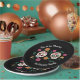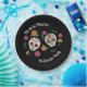 These custom party plates have a colourful Dia de los Muertos or Day or the Dead theme over a black background. Two sugar skulls are accented with pink and orange flowers, and floral greenery. A sample family name is printed under the skulls that you can personalise to include your own custom name or text.