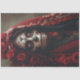 A striking Day of the Dead design featuring a woman in a vibrant red costume with her face artfully painted like a traditional sugar skull. Her elaborate headdress of rich red roses adds a touch of elegance and drama, perfectly complementing the festive and cultural significance of the celebration.