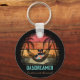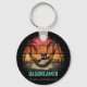 Daydreaming Cool Cat's Tropical Escape round keychain: A black cat wearing sunglasses and a Hawaiian shirt, lounging in a hammock between two palm trees, with a retro sunset in the background.