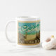 This Greetings From Daytona Beach vintage postcard design features a sandy beach with a beautiful turquoise ocean water and above the sea, a blue sky with billowy white clouds. In vintage travels style.