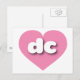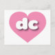 This postcard features a shapely and vibrant pink heart containing the bold, white, rounded lower case letters dc, a playful abbreviation for the District of Columbia. The reverse side of the postcard is blank, awaiting your personalised text or handwritten sentiments.