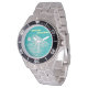 Has heft and feel of expensive stainless steel quartz watches. Good band with safety catch.  I removed links, which is easy because engraved arrows show direction to push the linking pins. As always by this seller, the image (a railroad logo) is a perfect reproduction of my emailed image, and is precisely spaced and aligned.