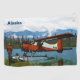 A bush pilot stands near his de Havilland Canada DHC-2 Beaver floatplane on the shore of a lake in the far north; mountains and trees are in the distance. Customisable text reading "Alaska" also appears. This image was derived, in part, from a US Fish and Wildlife Service photo.