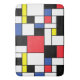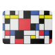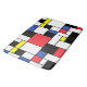 A simple minimalist geometry design inspired by the Piet Mondrian neoplasticism art movement, with bold white lines and red, blue, and yellow squares and rectangles against a black background.