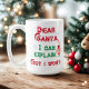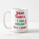 Bring some cheeky holiday humour to your morning coffee or hot cocoa with this whimsical Christmas mug! The design features the bold, playful phrase "Dear Santa, I Can Explain... But I Won't" in vibrant red and green lettering, accented by adorable Santa hats, snowflakes, and a upside down naughty elf for that perfect festive touch.