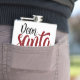 The flask itself is fine. It’s a cheap flask, obviously bought in bulk, however am prepared to overlook that. Given that it is a personalized item, I would have liked to have seen gift boxing instead of the generic packaging. Terrible printing, and/or quality. It’s a cheap, tacky vinyl. It is not cut straight and is also applied in a way that it is overhanging the bottom, causing the glue to catch on items and it will eventually roll and tear, damaging the wrap.