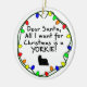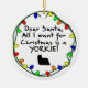 Dear Santa, All I want for Christmas is a Yorkie! Super cute dog lover ornaments, stamps, stickers and more, perfect for including your favourite pet in the holiday season. A colourful string of Xmas lights circles the outside, while a child's note to Santa and his drawing of the dog breed are in the centre. Very cute Yorkshire Terrier design!