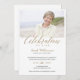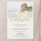 Honour a beautiful life with our celebration of life memorial photo invitation. The deign features "Celebration" in an elegant faux gold typography with full photo placeholder to display your loved one's photo. Designed in simple layout to display your memorial service details.