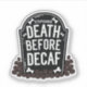 This darkly humourous sticker is perfect for coffee lovers who can't function without their caffeine fix! Featuring a tombstone with the phrase "Death Before Decaf" and a scattering of coffee beans, this design is a fun way to express your love for coffee. Personalise it by adding a name to the tombstone, making it a unique gift for yourself or a fellow coffee addict. Made with durable vinyl, this sticker is great for laptops, water bottles, and more.