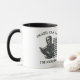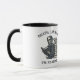 This mug features a skeleton in a hooded robe reading a book, positioned in front of a tall stack of books, with the phrase “Death Can Wait I’m Reading” printed above and below the illustration. The layout is centered and balanced, creating a clear focal point.