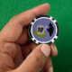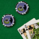 This awesome set of poker chips features an image of the Grim Reaper, also known as Death, created using vectors. He stands menacingly in a cemetery holding his scythe in his bony white hand. His sunken purple eyes and demonic grin are only just visible underneath his black cloak. In the background there is a gravestone with RIP painted on it in creepy black.