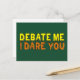 Debate me, I dare you. A confident speech and debate team quote by an opinionated person who can argue their way through any oration discussion or competition. Cool bright yellow and orange text on this orator humour postcard for a public speaker. Have the confidence that you will win any argument.
