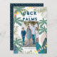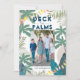 This "deck the palms" Christmas holiday photo card features holiday lights, palm trees and tropical leaves on a white background. The reverse side features a navy blue background with white snow patterns. Personalise it for your needs. You can find matching products at my store.