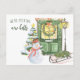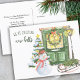 We're Decking New Halls 2 in 1 Christmas postcard and moving announcement. Festive christmas front door, decorated with holly wreath and garland. The scene is set with cosy home elements including glowing lantern, christmas tree, snowman and sledge. It is lettered with "We're Decking new halls" and the rest of the wording is fully editable and easy to personalise with your season's greeting, such as wishing you a Merry & Bright christmas from our new home followed by your new address and names.