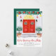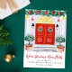 Elegant holiday moving announcements displaying a painted red front door decorated with watercolor Christmas wreaths, winter evergreen garland, Christmas ornaments, and potted boxwood shrubs with holly berries. The phrase "We're Decking New Halls" is displayed in a red, hand-lettered modern script with your new address and name below.