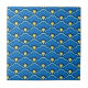 Ceramic tile in a Chinese scallop or wave pattern, traditional in textile and enamel work, in ocean / cerulean blue, turquoise, dark indigo, and an accent of light butter yellow