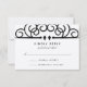 Designed to coordinate with our Deco Flourish wedding invitation set, this elegant black and cream wedding response card features an ornate vintage flourish illustration at the top with your RSVP details, including date and custom text, in a mix of deco and script typefaces.
