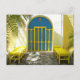 An inviting entrance accented with yellow benches and a beautiful blue door.