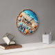 A beautifully designed wall clock featuring a beach and ocean theme, adorned with seashell artwork and inspiring text, evoking a relaxing coastal ambiance.