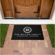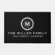 Modern doormat features simple design with stylised elegant monogram medallion in black and white with modern typography. Personalise with custom monogram initial, family name and street address, or or use the "contact this designer" button for help. A perfect wedding or housewarming gift for the stylish couple.