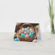 This unique card features several decorative and colourful eggs in an Easter basket.